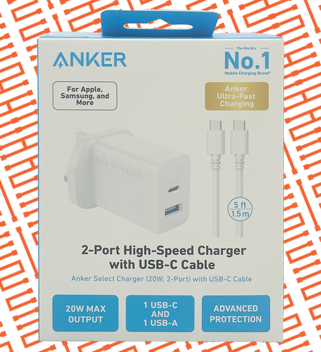 ANKER 20W [PD][USB] HI SPEED DOUAL PORT CHARGER WITH CABLE